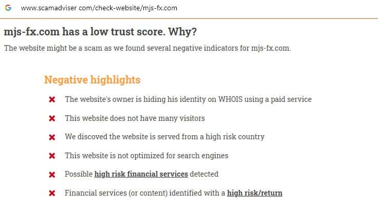 - Уровень доверия к сайту жульнической конторы MJS FX низкий
