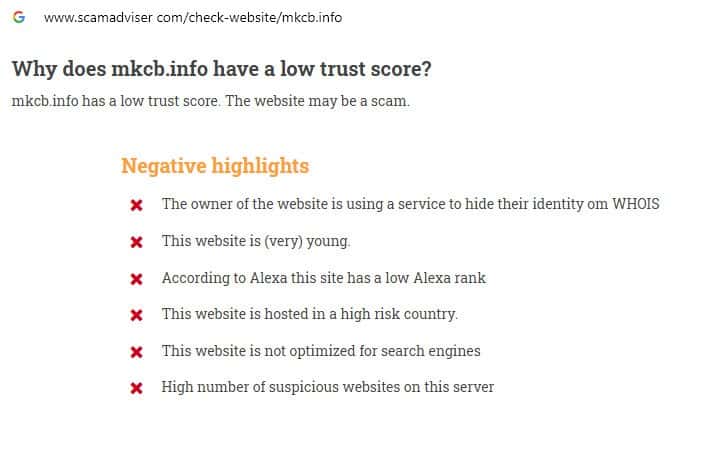 Проверка MKCB на сайте скамадвайсер ком показала, что у данного сайта низкий рейтинг, а также выявлено множество отрицательных моментов в работе сервера.