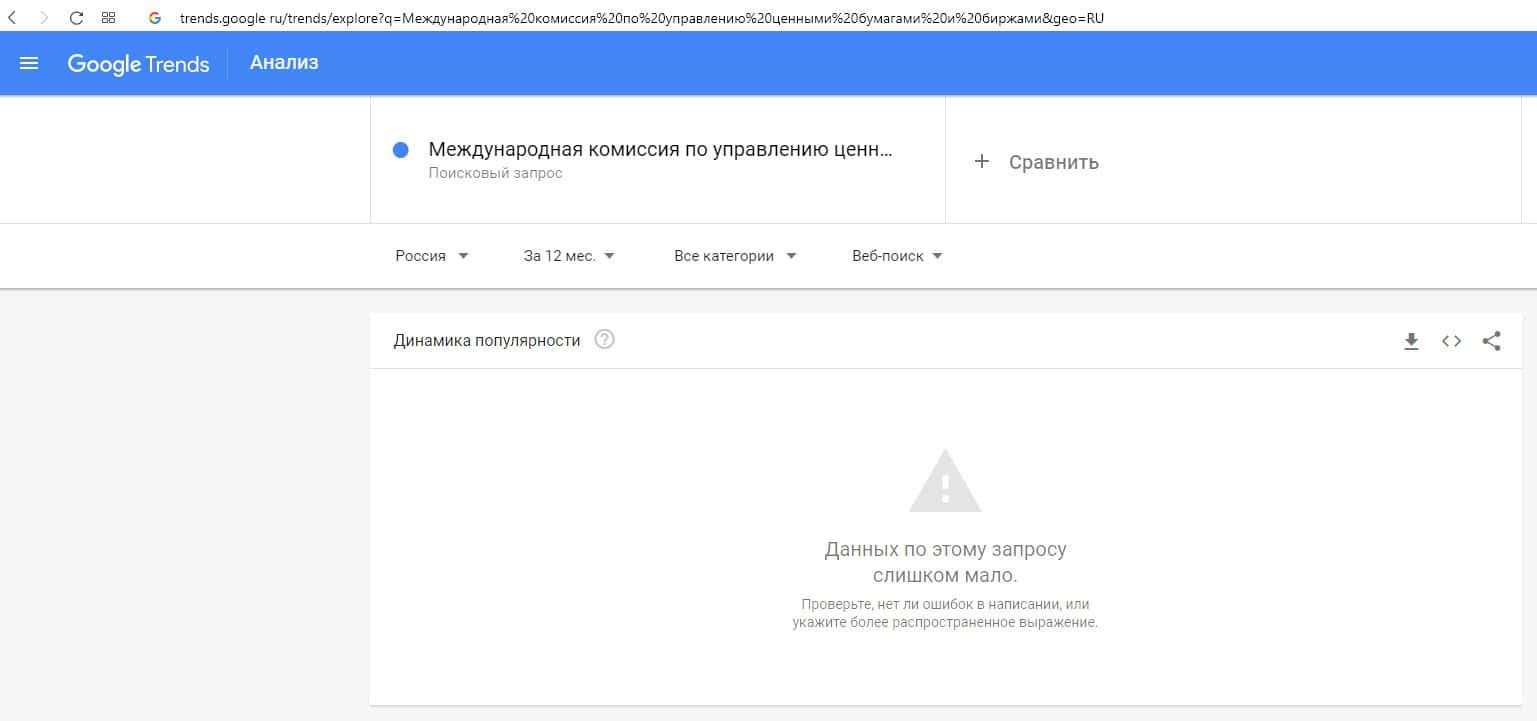 О запросах по бренду полного названия компании на русском языке "Международная комиссия по управлению ценными бумагами и биржами" на Гугл Трендс нет данных.