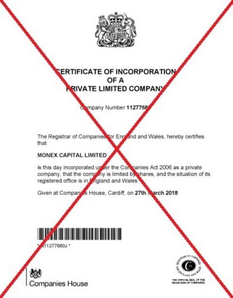 Судя по сертификату о создании компании Monex Capital, она находится в оффшоре Великобритании