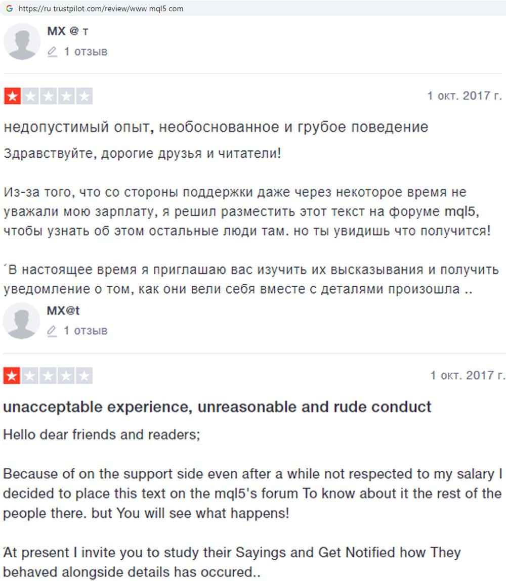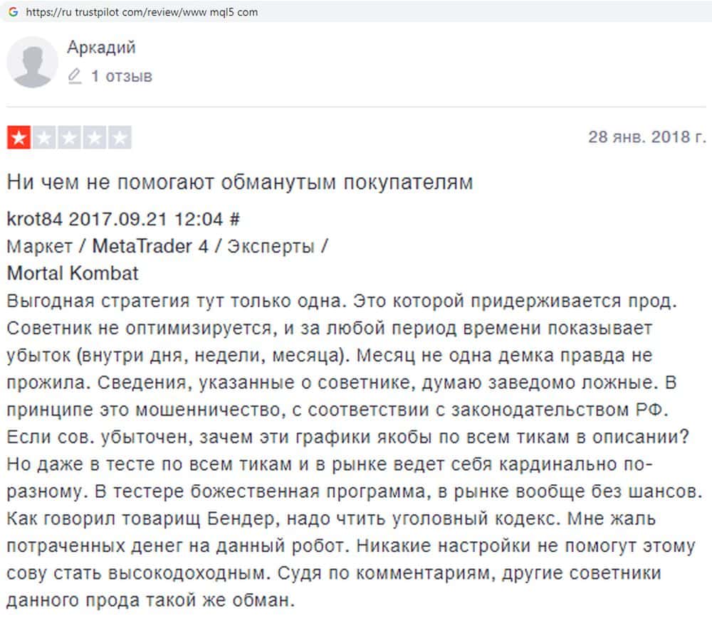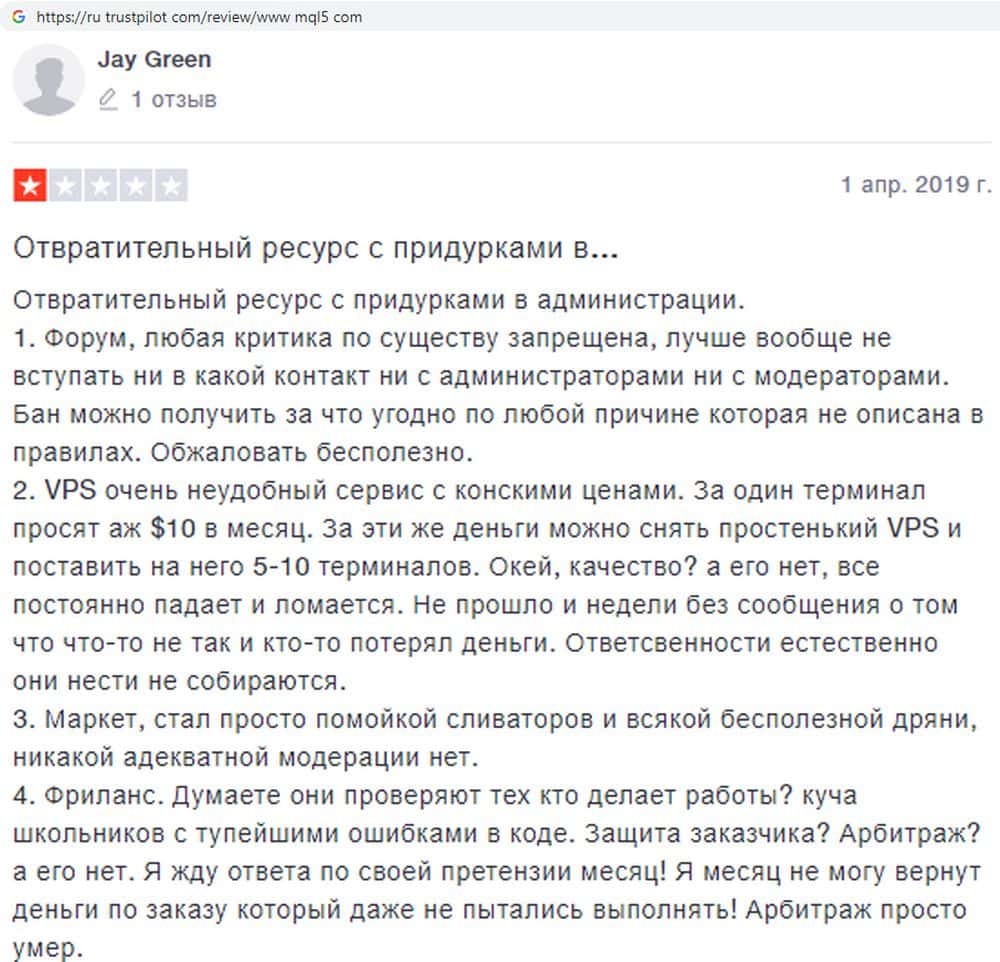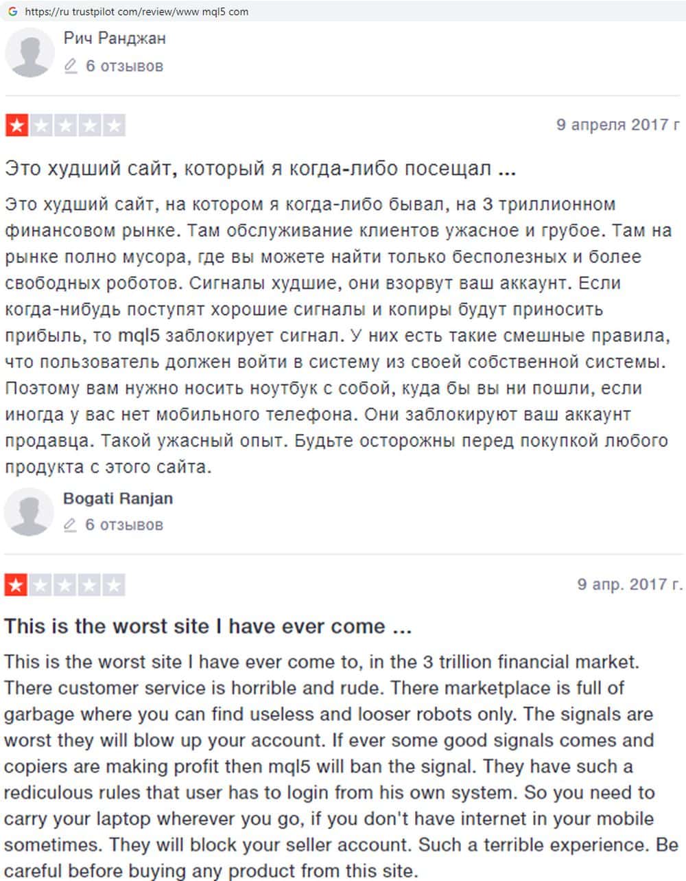 Онлайн-портал трастпилот ком пестрит сообщениями от трейдеров, которые столкнулись с грубостью и хамством со стороны жуликов MQL5 Com. Те не просто крадут деньги и продают липовые программки, которые работают в "обратную" сторону, сливая депозиты. Они еще и позволяют себе хамски относиться к трейдерам, грубить и оскорблять их.