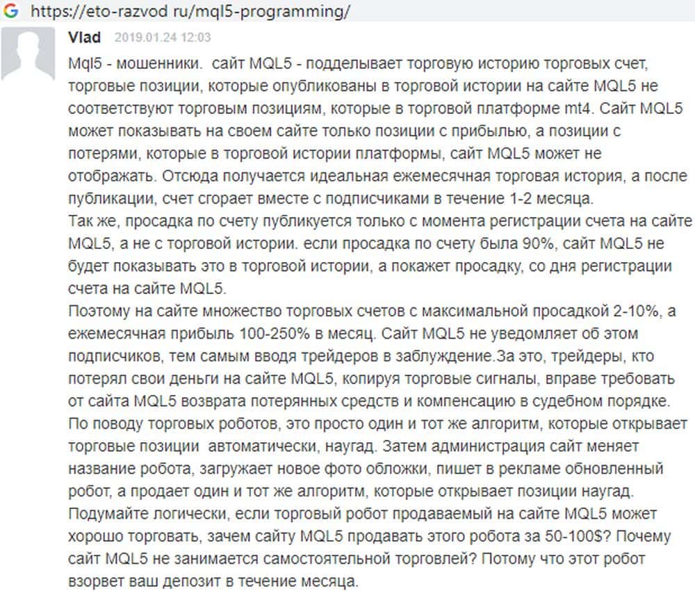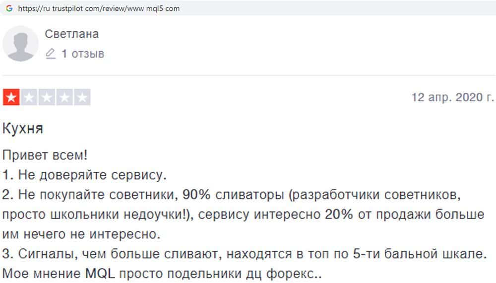 Количество негативных отзывов в сети на шарашкину контору MQL5 Com просто зашкаливает. Часть из них можно найти на ресурсе trustpilot com. Трейдеры с опытом, которые оперируют на биржах средними и крупными суммами, рекомендуют никогда не использовать продукт аферистов MQL5 Com, так как он создается специально для слива денег.