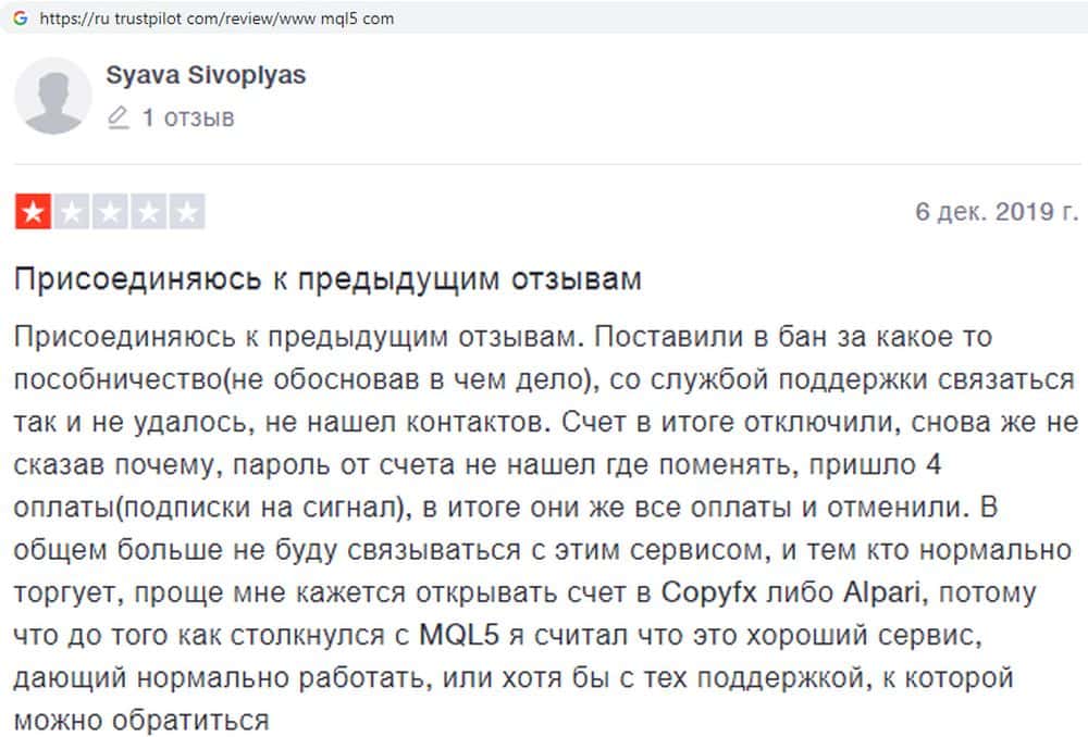 Кроме того, что псевдо-советники и сигналы мошенников ЭмКьюЭль 5 просто не работают, жулики могут сначала продать их, а потом заблокировать, не вернув деньги. Подобная история произошла с пользователем портала трастпилот ком. Его забанили без объяснения причин, продолжали высылать счета за нерабочие сигналы, а техподдержка перестала отвечать.