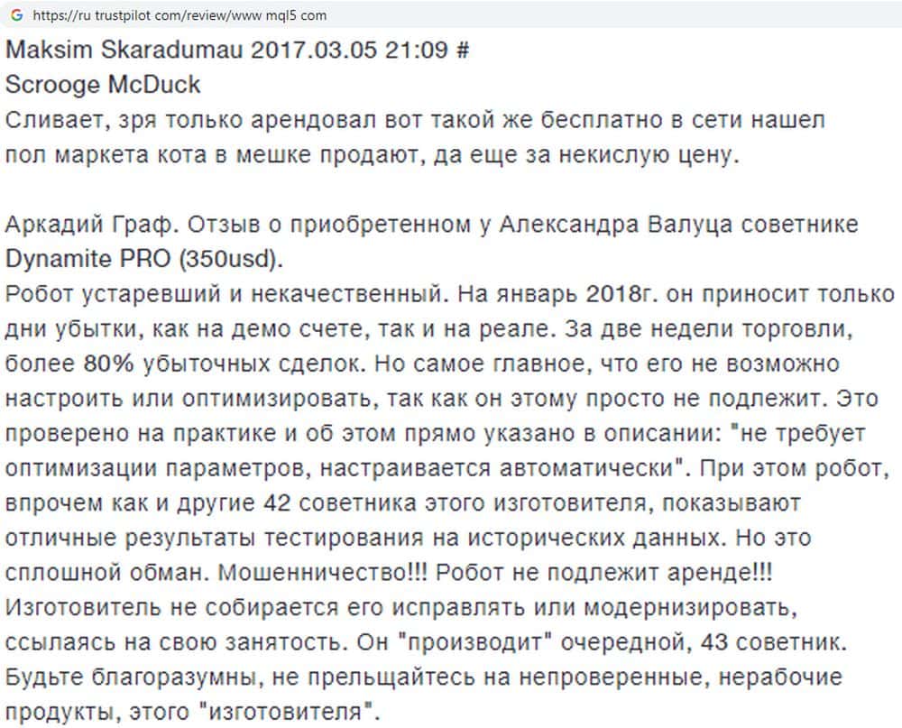Опытные инвесторы не советуют начинающим коллегам использовать советников, сделанных на основе языка псевдо-программистов ЭмКьюЭль 5. На портале трастпилот ком они объясняют, что боты не работают как должны, а просто сливают деньги. Но всем, кто решился высказать правду, жулики ЭмКьюЭль 5 затыкают рот и удаляют отзывы.
