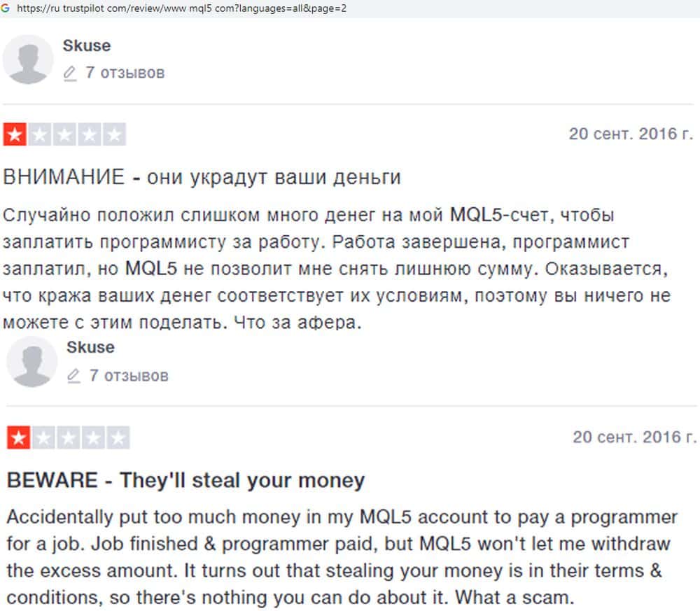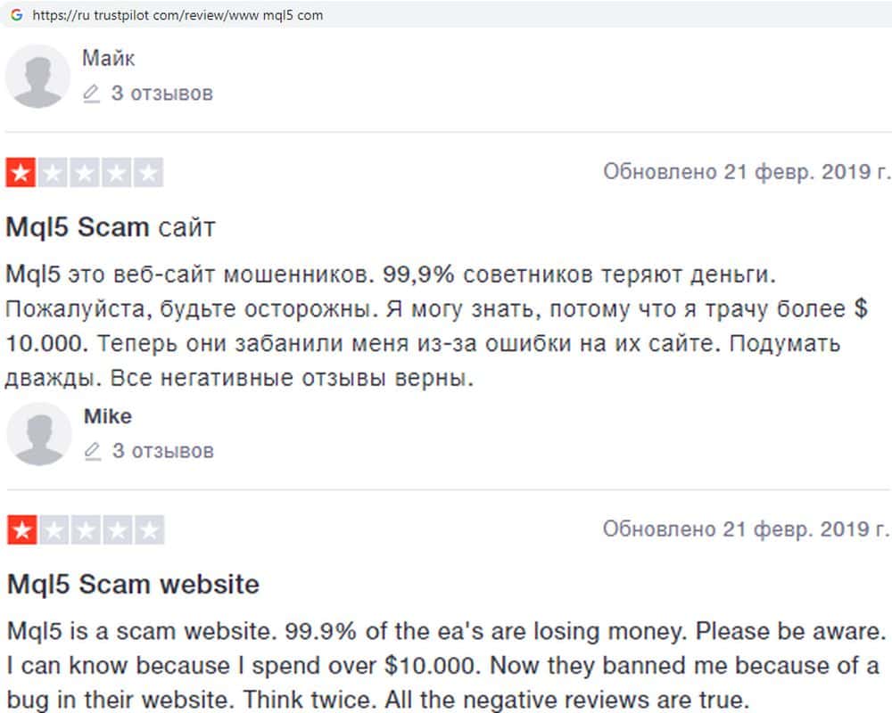 Как сообщают пользователи онлайн-сообщества trustpilot com, мошенники MQL5 Com позволяют себе творить все, что взбредет в голову. Они могут без причины и без уведомления забанить аккаунт трейдера, не возвращая денег за продукт, который был до этого куплен; удаляют негативные отзывы, не отвечают на письма и хамят в личной переписке.