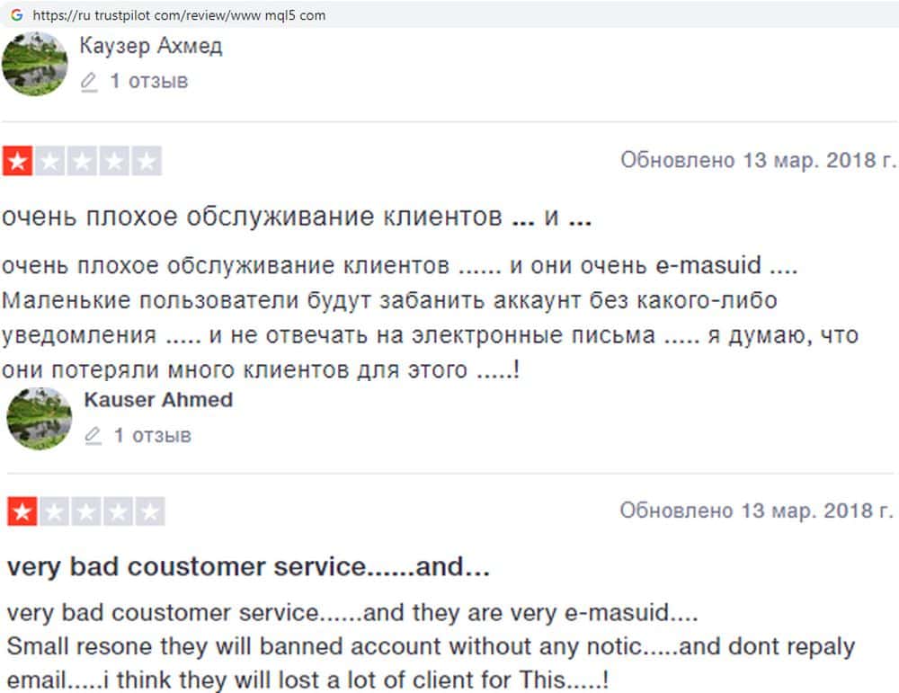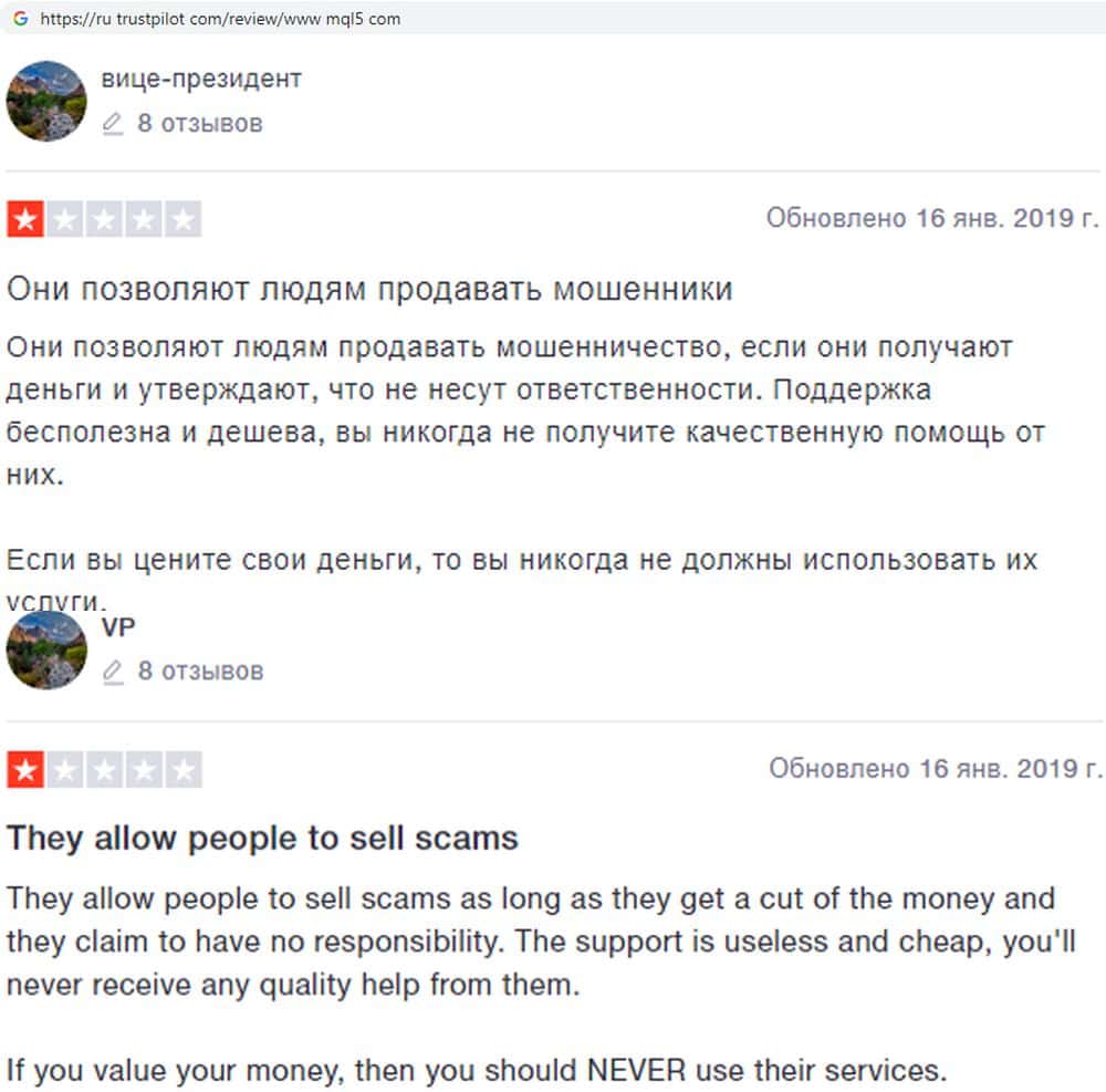 О том, что сотрудничество с пройдохами ЭмКьюЭль 5 сулит одни убытки, сообщает множество трейдеров, которые попались в сети лохотронщиков. На форуме трастпилот ком они делятся опытом и советуют коллегам воздержаться от использования скам-платформы. В лучшем случае жулики ЭмКьюЭль 5 просто не вернут вам деньги и отправят в бан.