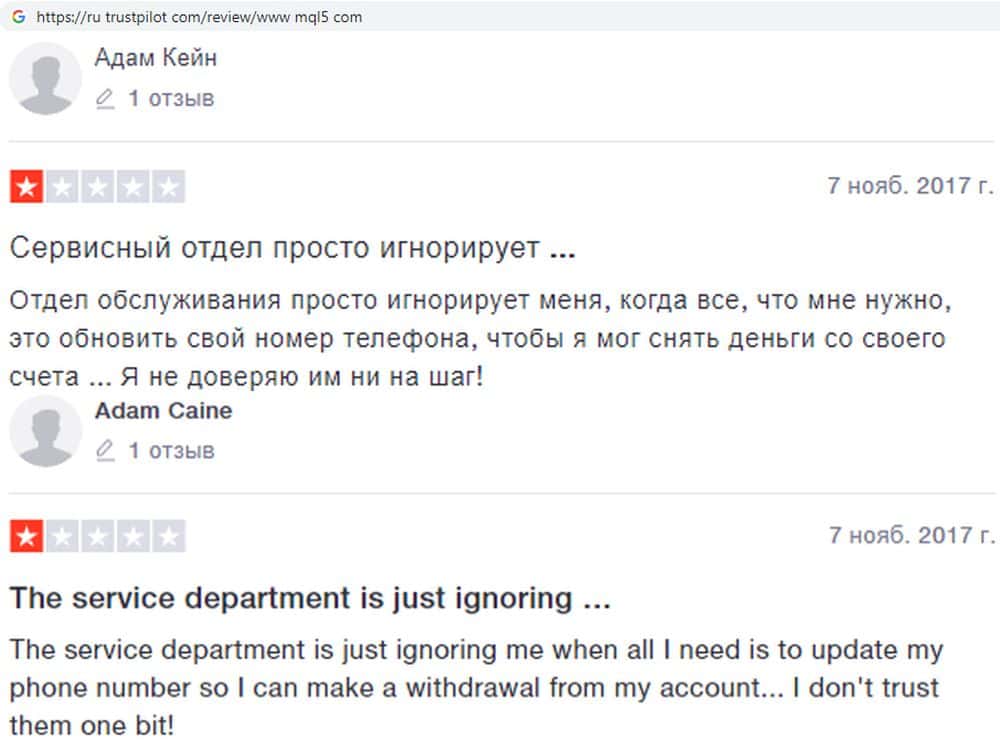 На том же ресурсе трастпилот ком трейдер рассказывает, как пытался снять деньги, оставшиеся на счету катал ЭмКьюЭль 5. Он планировал потратить их на покупку услуг лохотронщиков, но вовремя одумался. Но это не помешало злодеям ЭмКьюЭль 5 прикарманить всю сумму себе - они просто игнорировали его запросы на снятие.