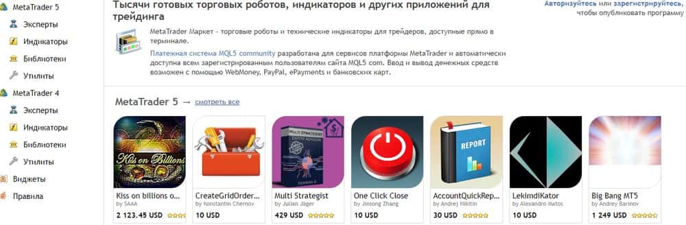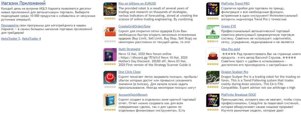 Магазин так называемых приложений от мошенников MQL5 Com - настоящая прорва, куда можно слить кучу денег без всякой отдачи. Цены на советников начинаются от 10 долларов и могут достигать нескольких тысяч. Описаны они так, что руки начинают чесаться, но на деле все заканчивается сливом депозитов в пользу брокеров-мошенников.