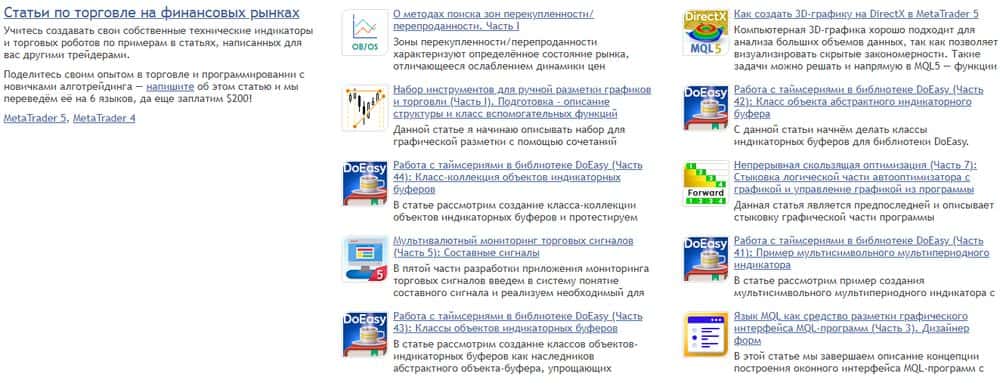 Следующий раздел - статьи, посвященные торговле на финансовых рынках. Среди них есть авторские работы, но большинство склепано копирайтерами. Все они активно рекламируют липовый продукт махинаторов ЭмКьюЭль 5 и пытаются убедить трейдеров, что только вложив деньги в бесполезные приложения, они смогут начать зарабатывать.