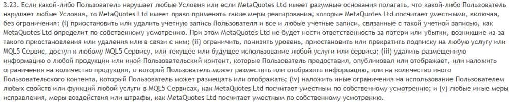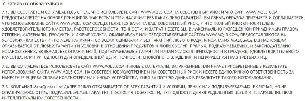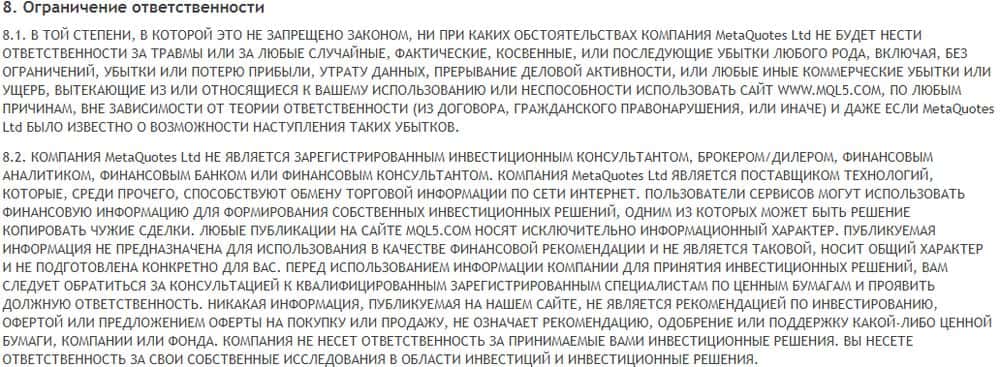 В соглашении есть приписка, что трейдеры пользуются услугами мошенников ЭмКьюЭль 5 на свой страх и риск. Все продукты, услуги, как и вся информация предоставляется "как есть" и за их работоспособность и достоверность, как и за ущерб, полученный в результате их использования, никто ответственность нести не собирается.