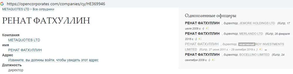 На сайте мошенников ЭмКьюЭль 5 о руководстве и команде не сказано ни слова. Но на портале opencorporates com можно узнать, что контора MetaQuotes Ltd управляется неким Ренатом Фатхуллиным. Директор аферы ЭмКьюЭль 5 успевает рулить еще несколькими компаниями, среди которых есть и конторы, замеченные в финансовом мошенничестве.