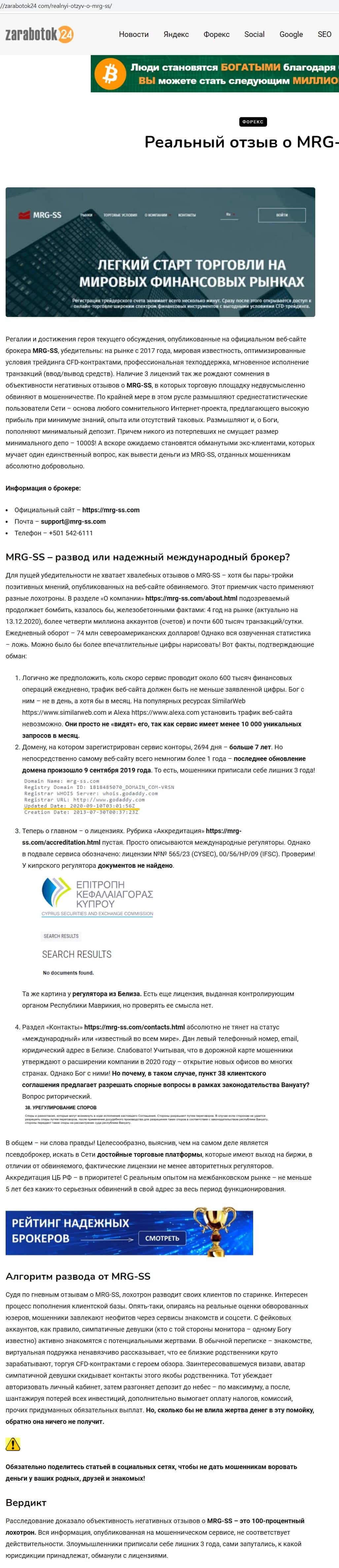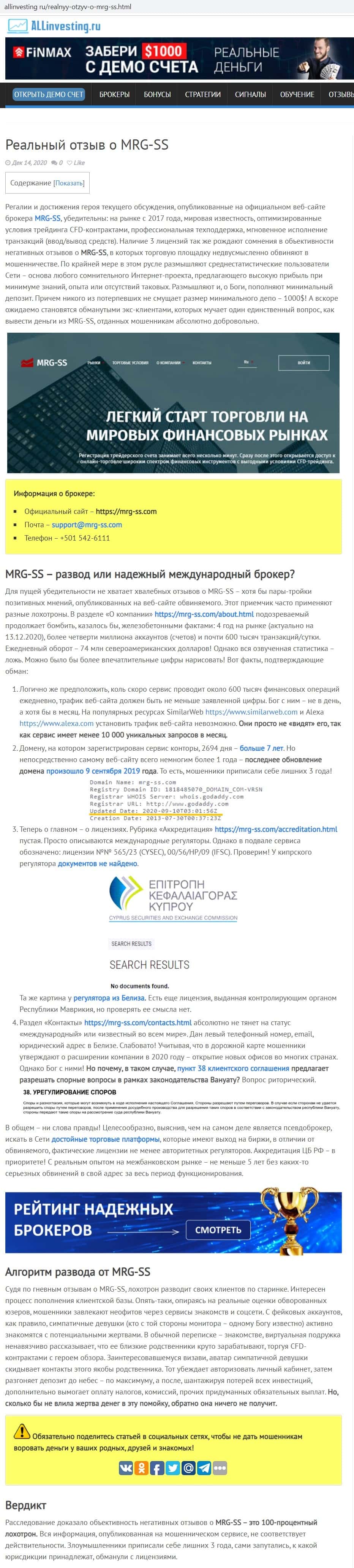 Автор публикации на сайте brokertribunal com уверен в том, что контора MRG SS Limited - очередные жулики и пройдохи, что и доказывает в своем разоблачительном материале.