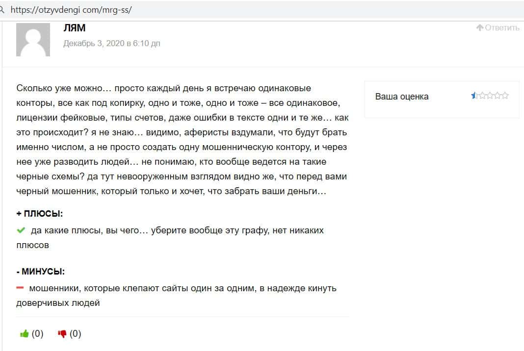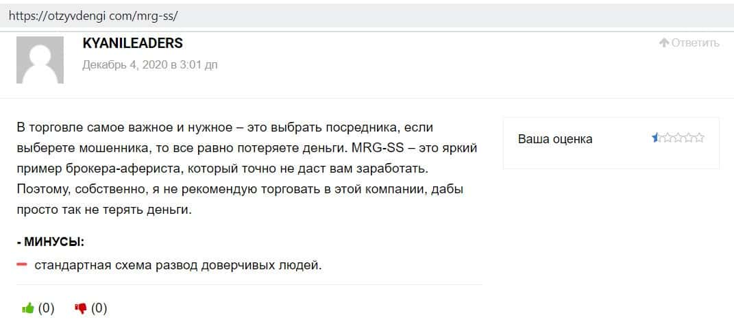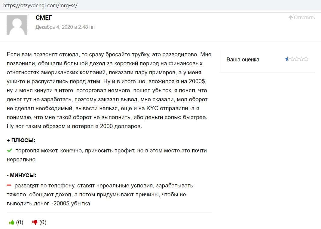 Другой пользователь написал, что контора MRG SS Limited - это явные мошенники, что понятно с первого же взгляда, как только заходишь на их лоховской сайт.
