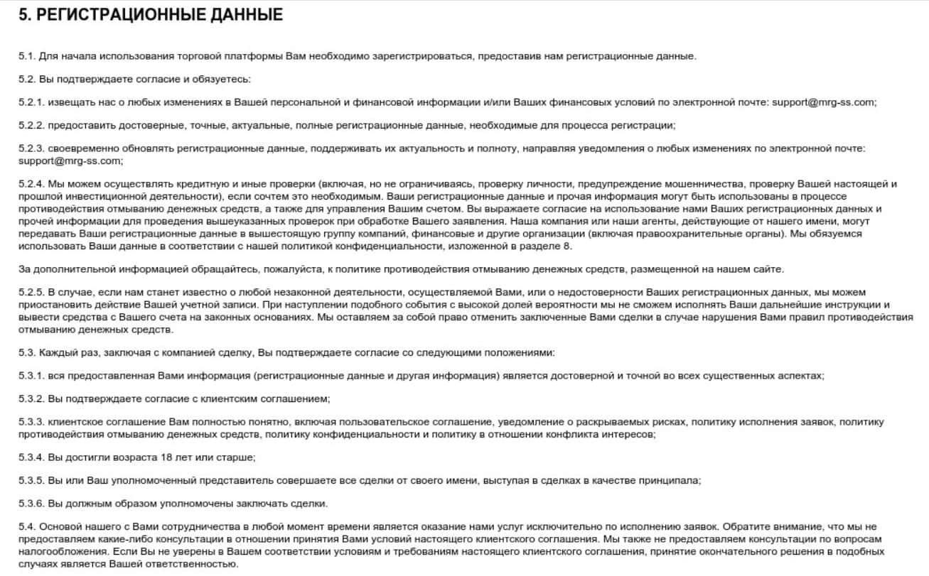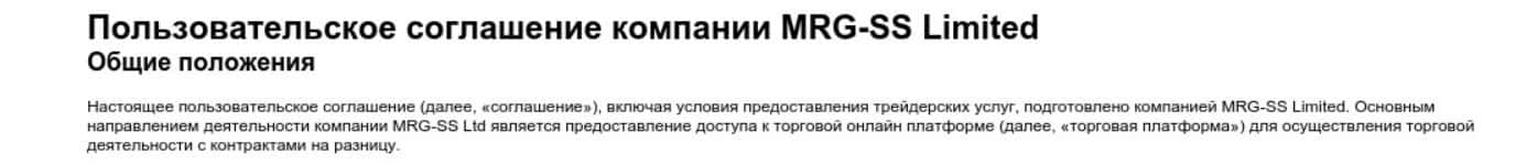 Клиентское соглашение брокерской компании MRG SS Limited