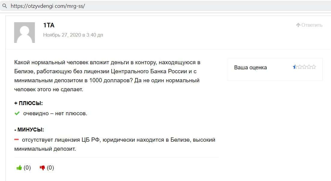 Отзыв на сайте Отзывденьги говорит о том, что ни один нормальный человек не понесет свои средства в контору типа MRG SS Limited, которая не имеет лицензии ЦБ РФ.