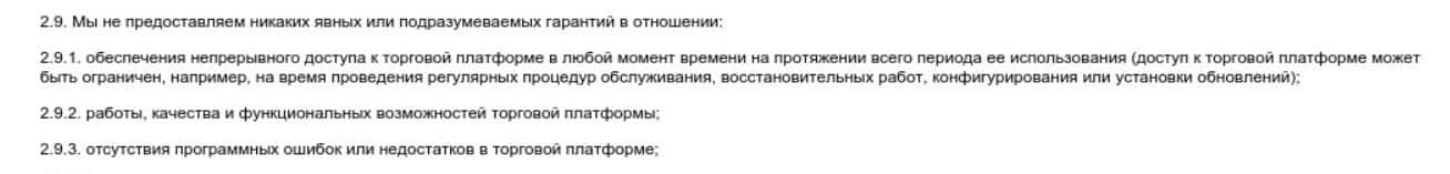 Пункт 2.9 договора брокера MRG SS Limited говорит, что компания не дает никаких гарантий в отношении качества работы терминала, а также технических сбоев.