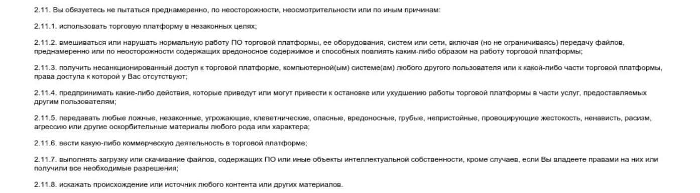В пункте 2.11 брокер MRG SS Limited описывает действия, запрещенные для пользователя на его платформе, такие, как использование в незаконных целях, и другие.