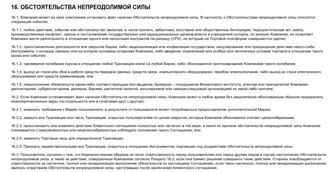 Раздел под номером 16 говорит о том, что компания MRG SS Limited может самостоятельно установить обстоятельства непреодолимой силы и перечисляет их.