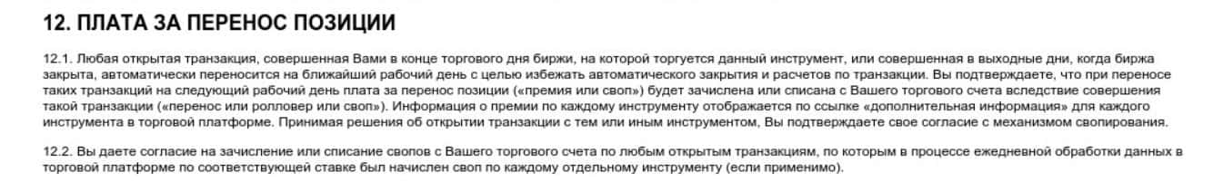 В разделе 12 пользователь может узнать о дополнительной комиссии, которую будет брать с него MRG SS Limited - плата за перенос позиции.