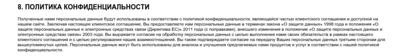 Восьмой раздел клиентского соглашения конторы MRG SS Limited рассказывает о политике конфиденциальности, применяемой на ее сайте.
