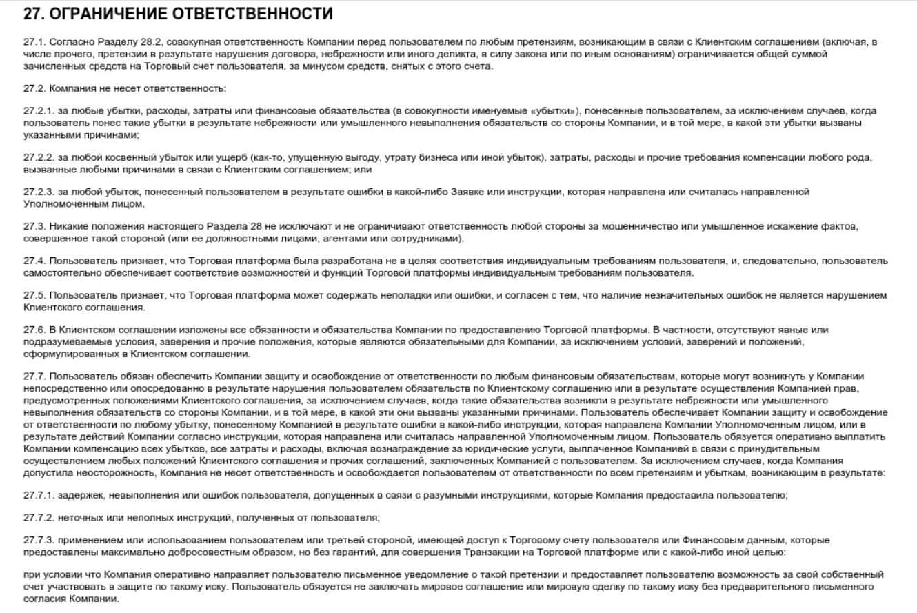 В 27 разделе брокерская компания MRG SS Limited снимает с себя всякую ответственность за любые потери и убытки клиента на своем сайте, к чему он должен быть готов.