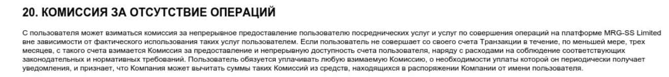 В разделе 20 компания MRG SS Limited предупреждает клиента, что берет с него комиссию даже за отсутствие операции на его счета.