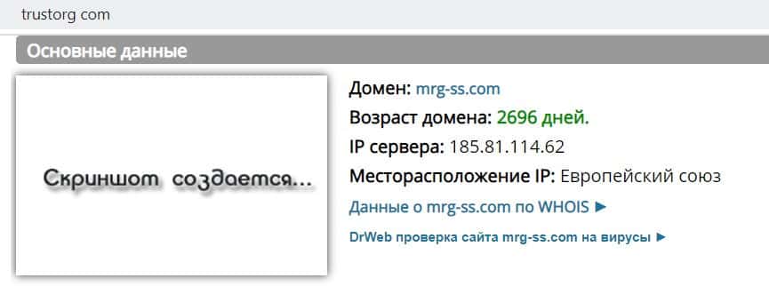 По данным сайта Трасторг, возраст доменного имени mrg-ss com составляет 2695 дней. Вероятно, домен выкупили у другой организации, чтобы подделать срок работы сайта.
