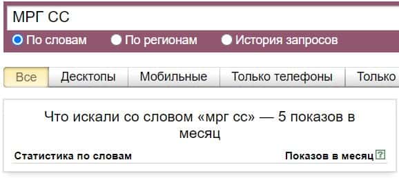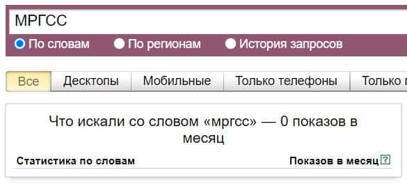 Название бренда на русском языке без пробела "МРГСС", пользователи не искали в системе Яндекс на разу.
