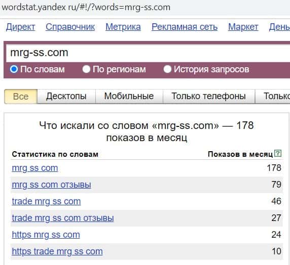 В поисковой системе Яндекс сайт брокерской конторы "mrg-ss.com", вбитый в строку с точкой, пользователи искали всего 178 раз.