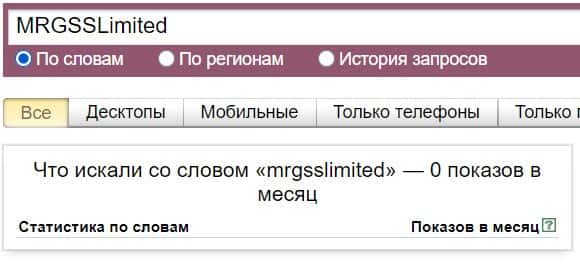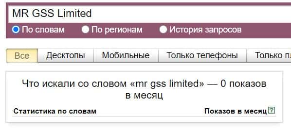 Название мошеннической конторы "MRGSSLimited", написанное на английском языке, пользователи не искали в системе Яндекс ни одного раза.