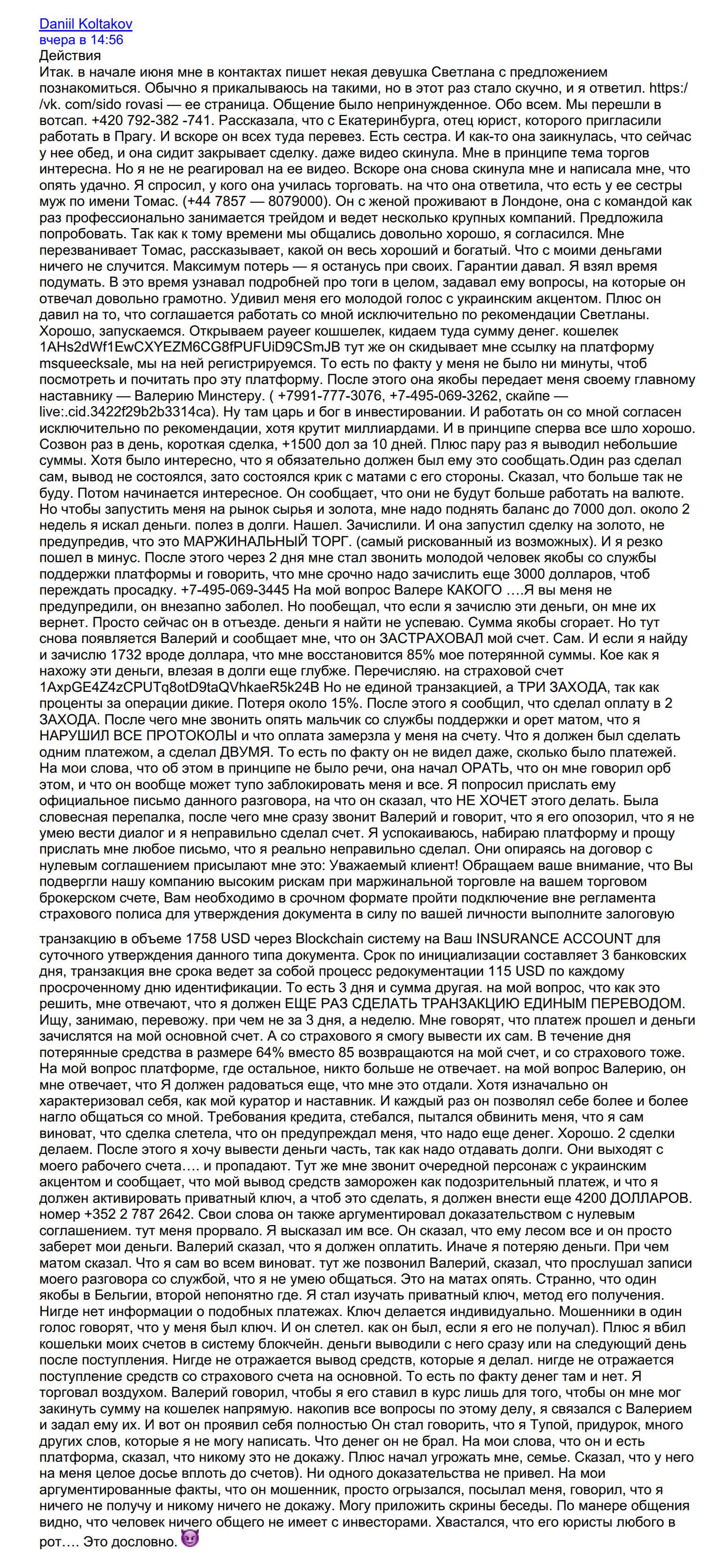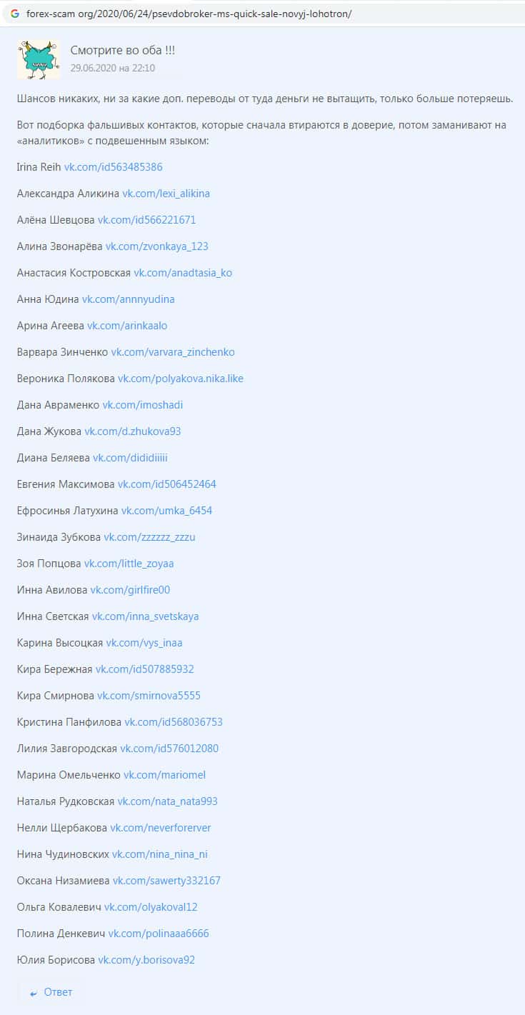 Пользователь оставил целый список фейковых страниц в соц сети Вконтакте жуликов МС Квик Сейл, которые умеют уговорить человека начать торговать на их фальшивом сайте.