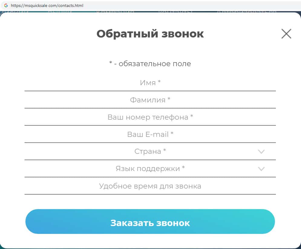 Жулики MSQuickSale предлагают пользователям заказать обратный звонок, в бланке просят указать свое имя, фамилию, номер телефона, адрес электронной почты, страну проживания.