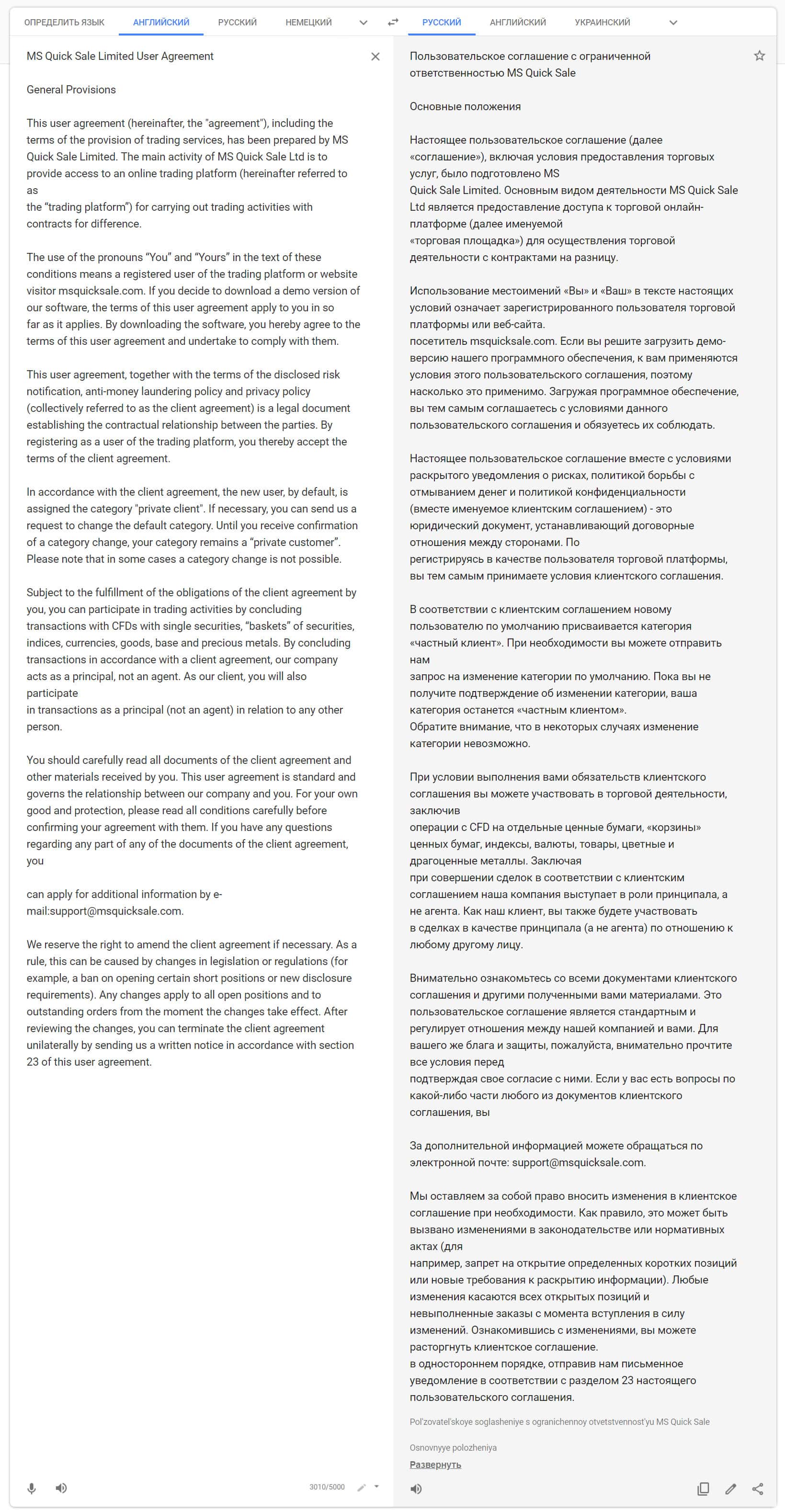 Пользовательское соглашение на сайте скам-конторы MS Quick Sale