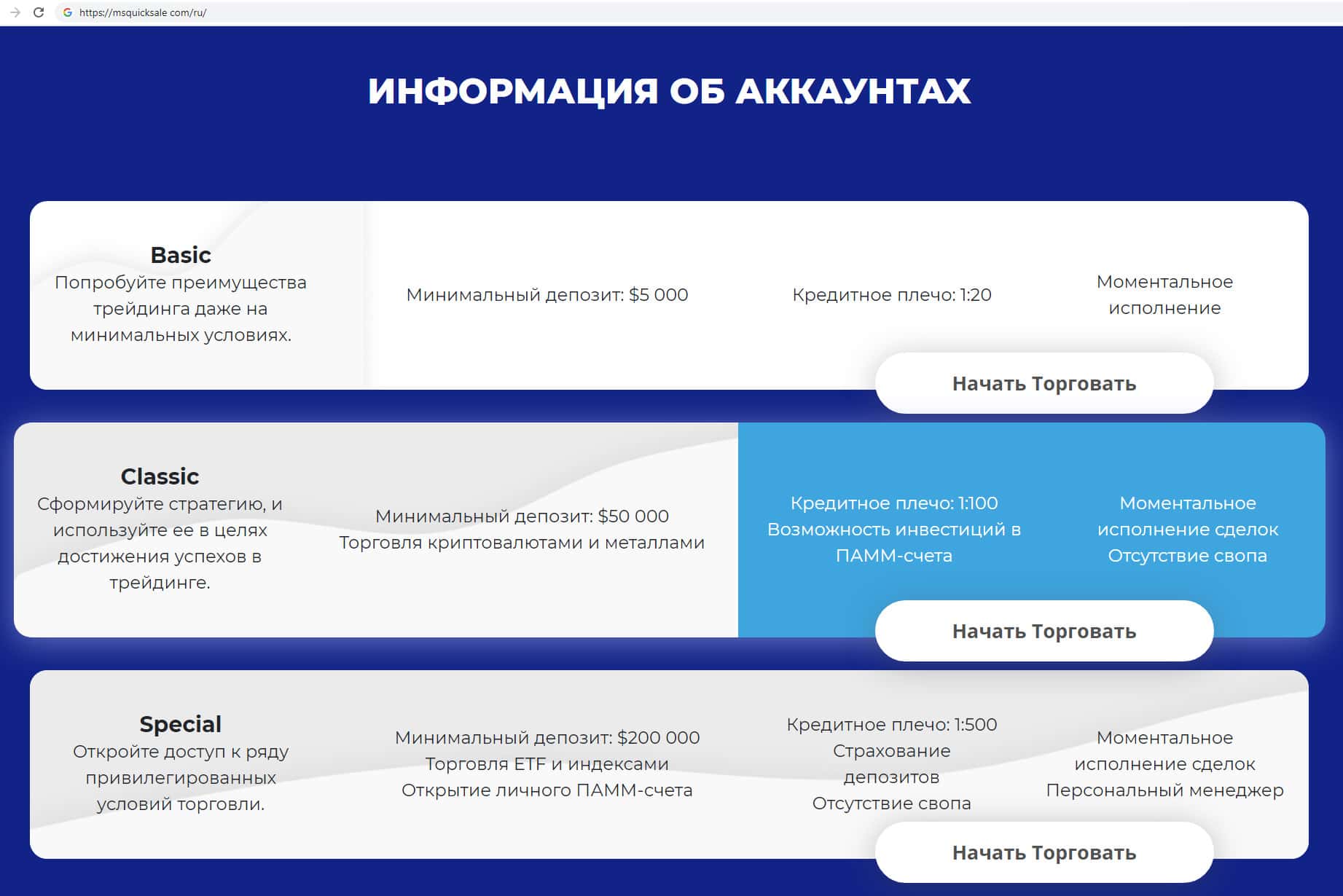 Мошенники MSQuickSale предлагают клиентам на выбор 3 типа торгового счета: Basic, Classic, а также Special. Реальный форекс стартует в основном с суммы в 100000 долларов.