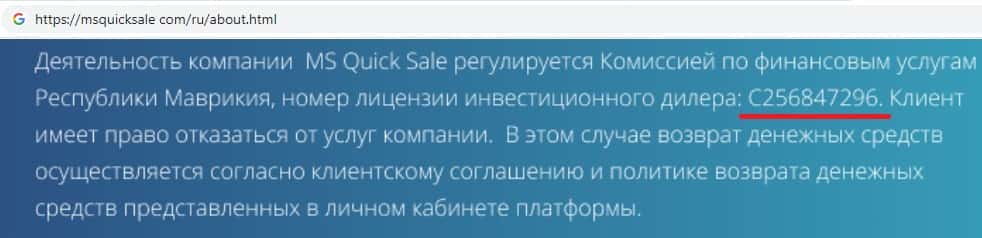 На сайте финансового регулятора республики Маврикий нет результатов о регистрационном номере брокерской конторы МС Квик Сейл, следовательно он вымышленный.