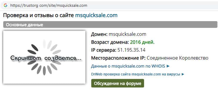 Проверка интернет-сервиса шулеров MS Quick Sale на trustorg com показала, что возраст домена к моменту написания статьи составляет 2016 дней, скорее всего домен купленный.
