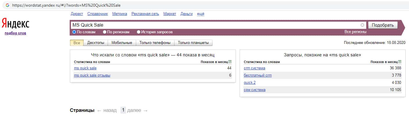 По количеству брендовых запросов названия компании на английском языке с пробелом "MS Quick Sale" на Вордстарт Яндекс Ру показатель 44 запроса за месяц.