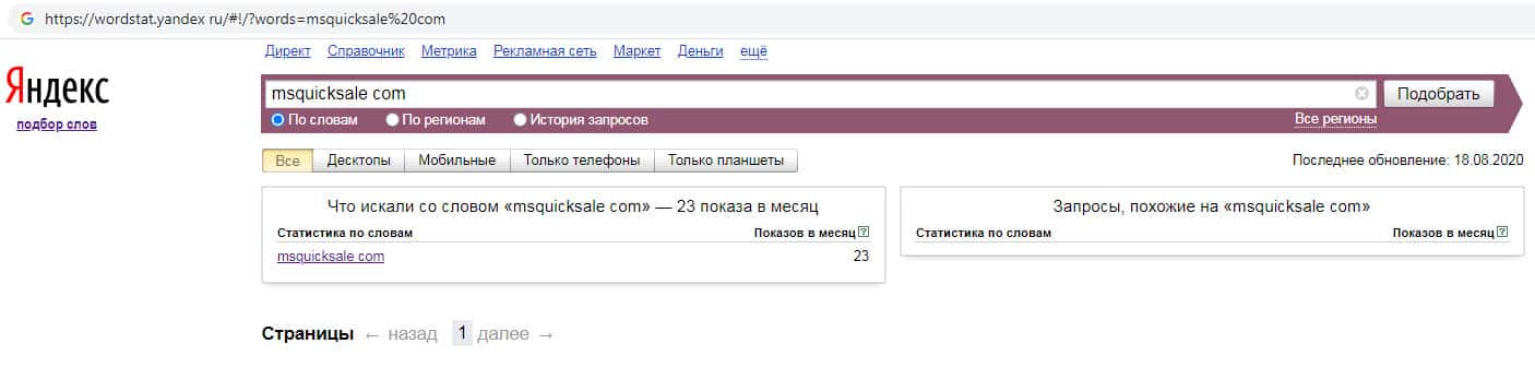 Количество брендовых запросов названия домена без точки "msquicksale com" на Вордстарт Яндекс Ру также составляет 23 запроса за месяц.