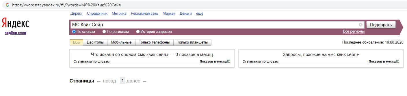 О запросах по бренду названия компании на русском языке с пробелом "МС Квик Сейл" в поисковике Yandex нет никаких данных.