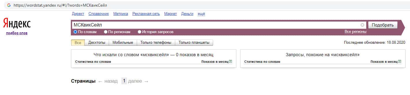 На wordstat yandex ru также отсутствует информация о брендовых запросах названия компании на русском языке без пробела, а именно "МСКвикСейл".