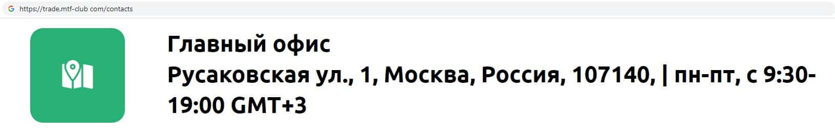 На сайте псевдо-брокерской организации МТФ Клуб вся информация о компании вымышленная, включая данные о местонахождении конторы.