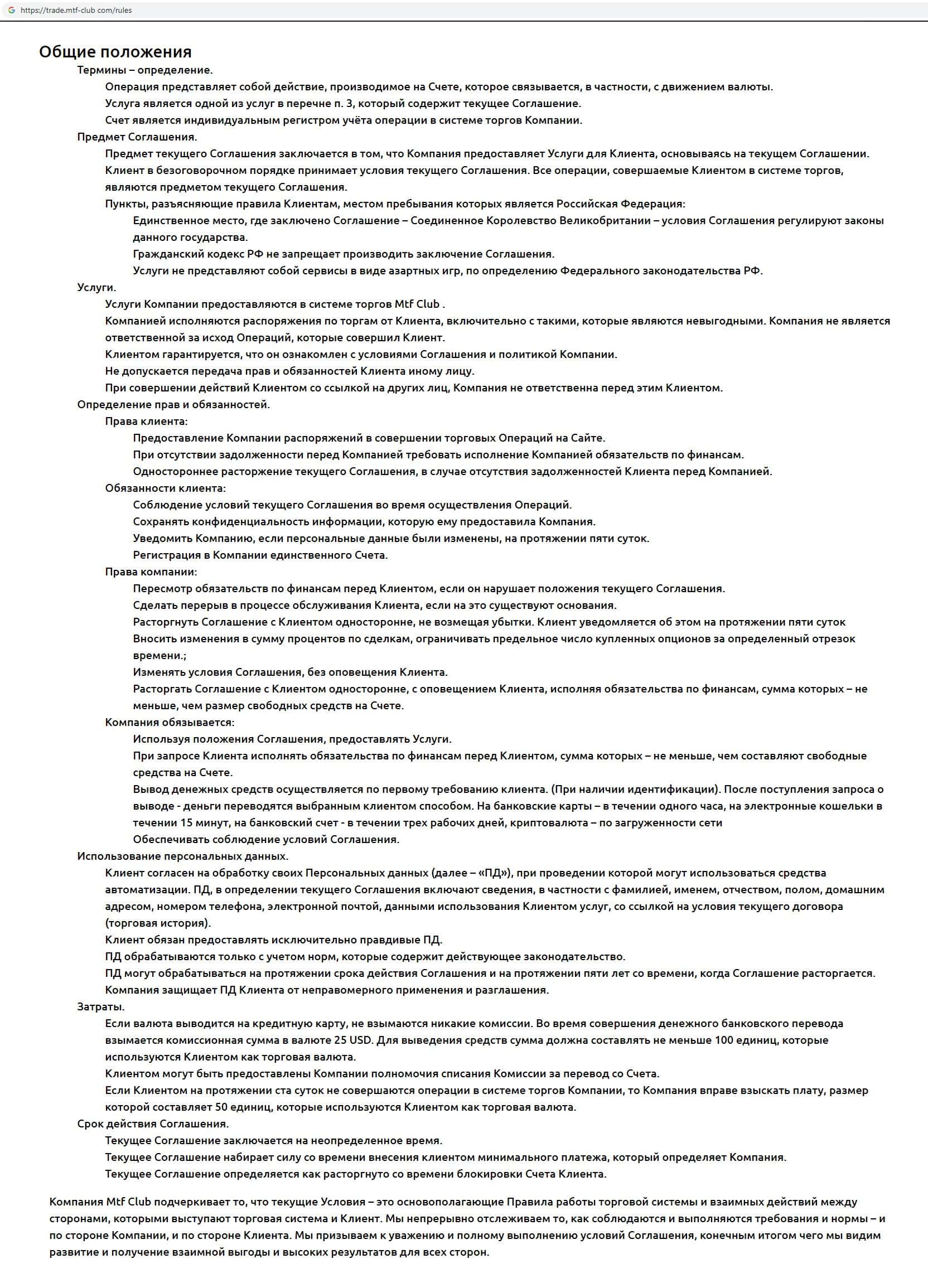 Клиентское соглашение компании MTF Club не имеет никакой юридической силы, больше напоминает инструкцию по использованию сайта.