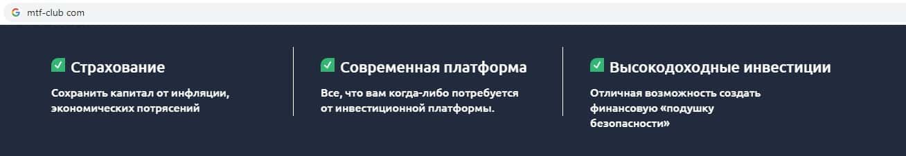 В данном разделе предлагаем увидеть скрин главной страницы веб-сервиса скам-организации МТФ Клуб, помните о том, что проекты часто меняют название домена своего сайта.