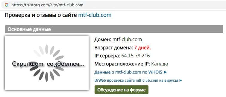 Проверка интернет-сервиса аферистов МТФ Клуб на trustorg com показала, что возраст домена к моменту написания статьи составляет 7 дней.