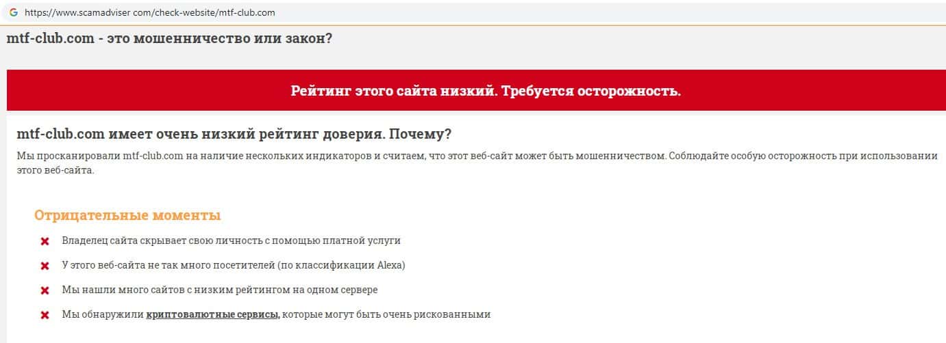 Проверка скам-конторы МТФ Клуб на сайте скамадвайсер ком показала, что у данного сайта низкий рейтинг, а также выявлено множество отрицательных моментов в работе сервера.