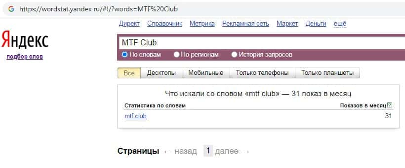 Количество брендовых запросов названия компании на русском языке с пробелом "МТФ Клуб" на Яндекс Вордстарт 6 запросов за месяц.