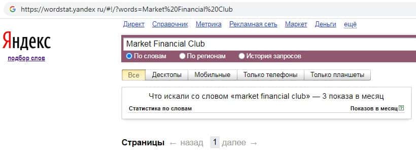 Количество брендовых запросов полного англоязычного названия компании "Market Financial Club" на wordstat yandex ru всего 3 запроса за месяц.