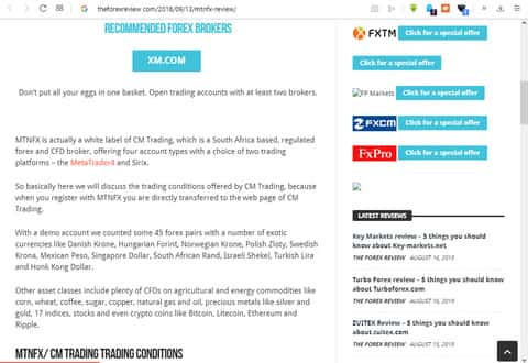 "MTNFX is actually a white label of CM Trading, which is a South Africa based, regulated forex and CFD broker, offering four account types with a choice of two trading platforms – the MetaTrader4 and Sirix." - слова автора статьи сайта theforexreview о проекте MTNFX, который явно был проплачен. Это понятно, так как информация в статье не соответствует действительности. А каждое слово - это ещё одно лестное слово о надежности и выгодности работы с этим недоброкером.