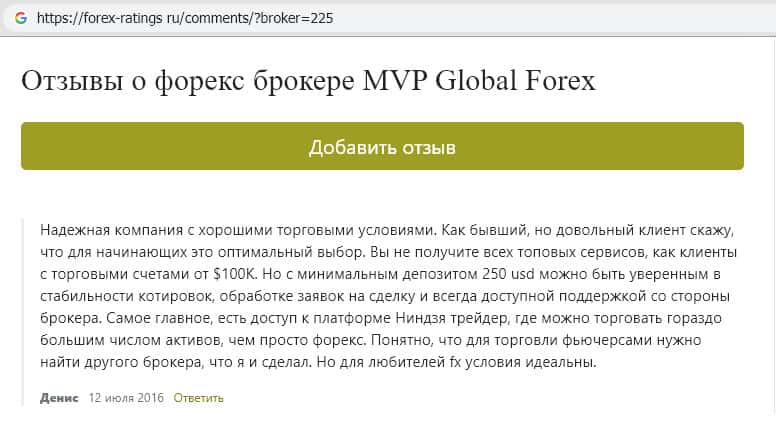 Портал forex-ratings ru опубликовал почти четыре года назад отзыв некоего Дениса, лестно отзывающегося о брокерской площадке МВП Файнейшнл. За всё это время других отзывов не добавилось, что довольно странно. В своём отзыве Денис указывает на стабильность котировок, точную обработку заявок на сделку и всегда доступную техническую поддержку брокера MVP Financial.