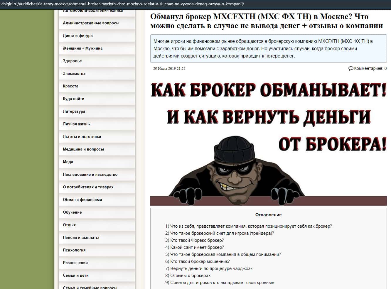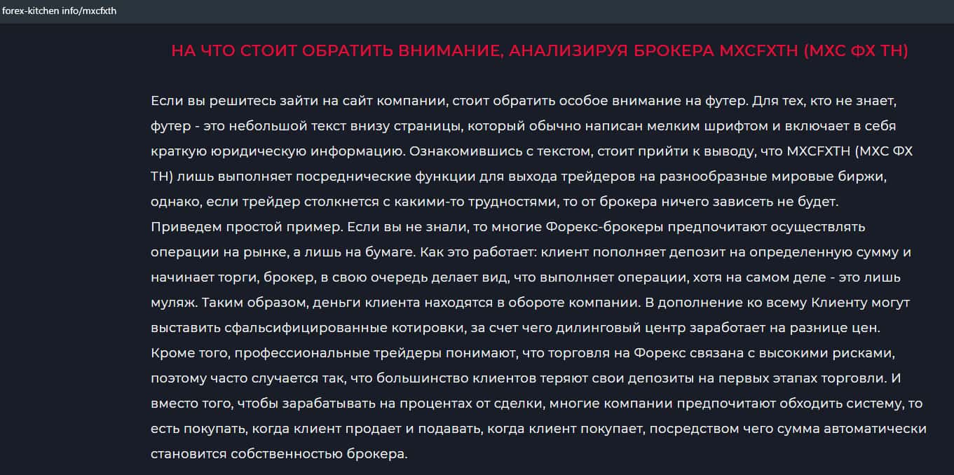 Как утверждает следующая статья, достаточно сложно понять, какой брокер перед вами, честный или нет. Поэтому следует отметить данное предложение от брокера MXCFXTH как предлог во всем разобраться. Ниже вы найдете информацию, которая точно убедит вас не вкладывать туда деньги.